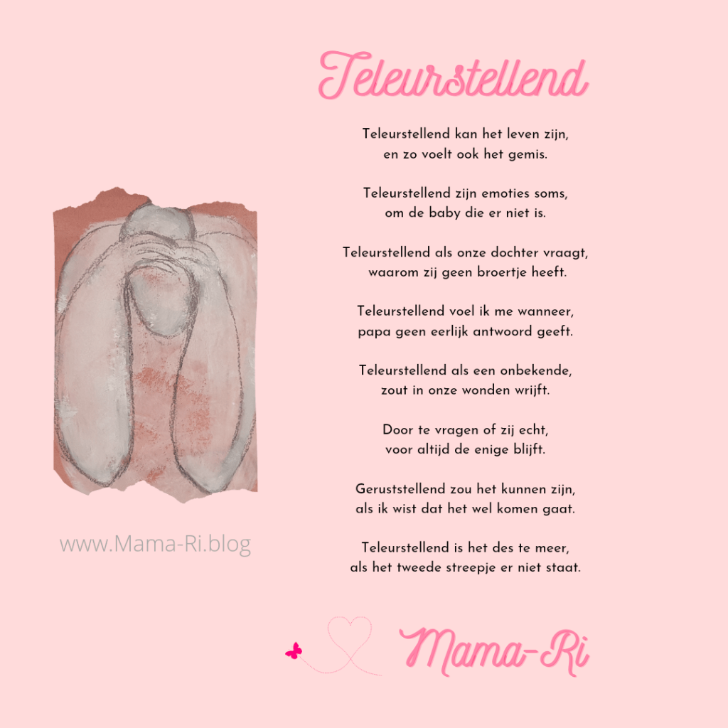 Deze week wil ik afsluiten met het gedicht waarin ik secundaire kinderloosheid onder woorden heb geprobeerd te brengen. Want ook al hebben wij een gezonde dochter en ook al maakt dat de situatie zeker anders, een onvervulde kinderwens is een onvervulde kinderwens. Of het nou de eersteš, tweedeš of derde isš…